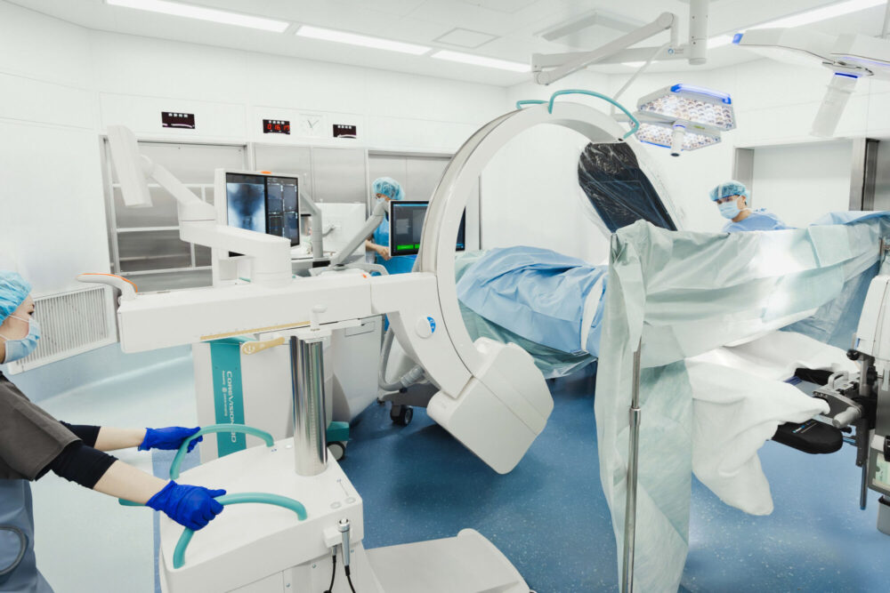 Cアームは、手術中に患者さんの身体を約180度スキャンし、骨・神経・血管の状態を三次元(3D)画像として描出する装置です。